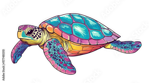 Turtle walking on a white background with its shell visible, isolated and looking cute
