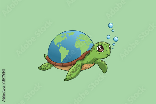 Turtle with World Shell Cartoon Vector Icon Illustration