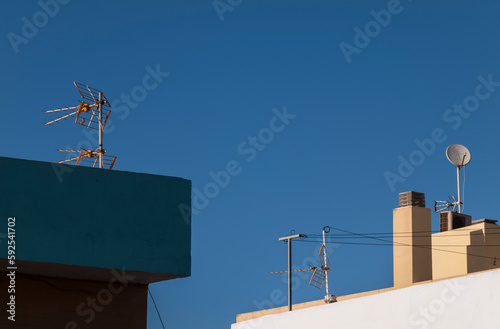 Tv antennas on roof top against blue sky. Almeria, Spain