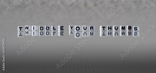 twiddle your thumbs word or concept represented by black and white letter cubes on a grey horizon background stretching to infinity