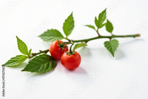 Twig and tomato still life composition on white background, botanical, nature