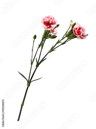 Twig of red and white carnation flowers with green buds and leaves isolated