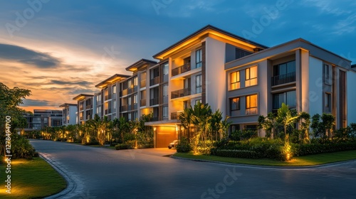 apartment, complex, building, twilight, sunset, driveway, evening, night, residential, property, home, real estate, architecture, modern, luxury, condo, house, urban, city, development, landscape, exterior, design, lifestyle, illumination, lighting, structure, residence, accommodation, housing, investment, community, neighbourhood, suburb, location, view, skyline, scene, image, photo, picture, gallery, showcase, portfolio, collection, asset