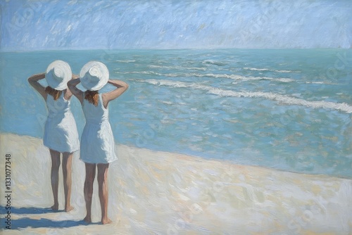 Twin girls wearing white dresses and wide-brimmed hats stand on the shore, gazing at the tranquil sea under a clear blue sky. The serene beach setting creates a peaceful atmosphere.