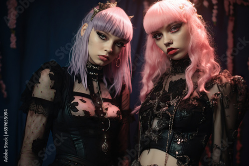 twin, gothic, contrasting, dark, pink, subculture, retro, 90s, 80s, black, underground, grunge, mystical, emo, grisly, female, beauty, young, fashion, woman, person, model, lady, hair, dress, pretty, attractive, white, caucasian, portrait, cute, lifestyle, adult, clothing, group