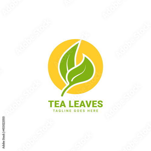 twin leaves and circle sun vector logo design for herbal drink, vegan food, and nature care