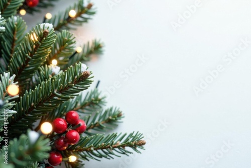 Twinkling Christmas tree branches intertwined with evergreen and holly garland against a snowy white background, winter, winter wonderland