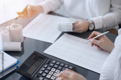 Two accountants use a calculator and laptop computer for counting taxes or revenue balance. Business, audit, and taxes concepts