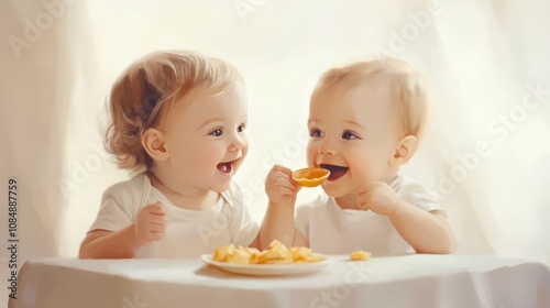 baby, children, children, infant, toddler, cute, adorable, happy, laughing, smile, joy, meal, eating, food, snack, sharing, friendship, family, love, care, innocence, childhood, pure, sweet, white, table, chair, background, sitting, together, play, home, indoor, little girl, sibling, twin, playful, fun, sister, innocent