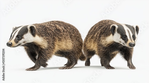 Two adorable baby badgers snuggling against a white backdrop, showcasing wildlife