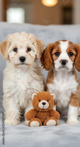 puppy, dog, cute, adorable, teddy, bear, toy, couch, pet, animal, friends, companion, domestic, mammal, furry, portrait, sitting, looking, eye, nose, ear, white, brown, grey, indoor, home, family, love, sweet, small, fluffy, soft, playful, happy, calm, relaxing, together, friendship, comfort, innocent, young, studio, pose, closeup, detail, texture, background, light, shadow