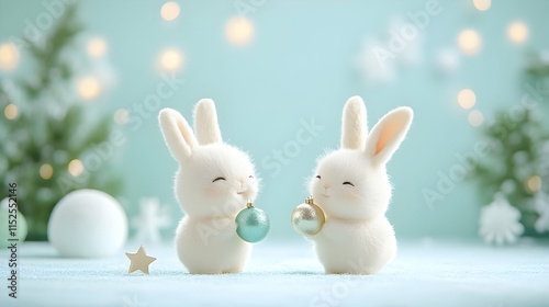 Two adorable white rabbits with ornaments, set against a festive backdrop of soft colors and holiday decorations.