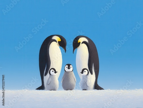 Two adult penguins stand with their three fluffy chicks on bright snow. The background features a clear blue sky, creating a serene winter scene.