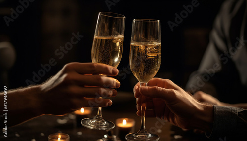 Two adults holding champagne flutes in a celebratory toast generated by AI