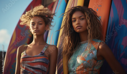 Two African American girls stand against a background of colorful surfboards, generative AI