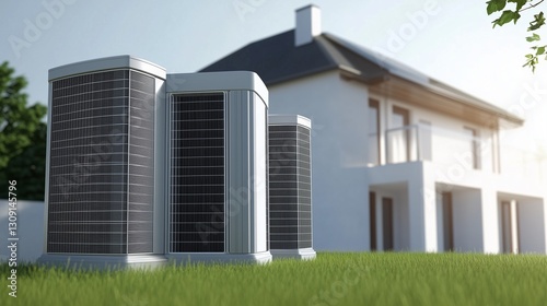 Two air conditioners in front of a house. Air clean energy home. The pump is installed in the heat source. A pair of air conditioners positioned in front of lifestyle a house.