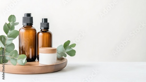 Two amber bottles with black pump heads sit on a bamboo tray adorned with eucalyptus leaves, showcasing natural hair care products against a white backdrop
