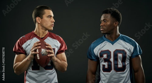 football, player, american, sport, facing, holding, game, athletic, teammate, competition, team, uniform, gridiron, male, athlete, strategy, offence, defense, determination, black, caucasian, youth, adult, teamwork, strength, stance, sharpened, preparation, rivalry, sportsmanship, exercise, fitness, concentration, intensity, gear, field, practice