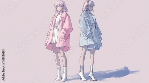 anime, girl, girl, pastel, pink, blue, coat, coat, fashion, style, stylish, trendy, dress, dress, boot, white, shoe, illustration, drawing, art, artwork, digital, painting, graphic, design, elegant, cute, pretty, lovely, sweet, delicate, feminine, graceful, slender, pose, standing, model, hair, short, blond, lilac, outfit, clothing, apparel, accessory