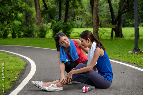 Two Asian young girls exerciseing in park one get leg injure during jogging one take care of friend