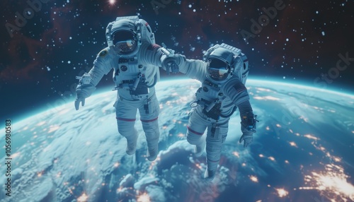 Two Astronauts Floating in Space Above Earth