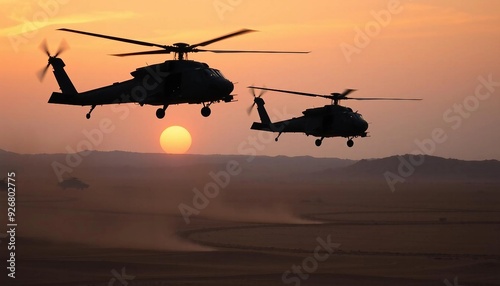 helicopter, attack, flying, sync, desert, dusk, silhouette, orange, sky, dramatic, intense, preparation, strike, depth, field, sunset, lighting, mood, military, aviation, power, formation, coordination, mission, shadow, contrast, warfare, combat, action, motion, blade, rotor, evening, horizon, glow, atmospheric, precision, armed, defense, strategy, operation, darkness, twilight, silhouette, outline, adventure, energy, helicopter