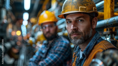 men at work, industrial, workwear, male, plant, environment, industry, safety, teamwork, engineering, machinery, factory, colleague, occupation, concentration, professional, labor, facility, equipment, orange, steel, metal, sharpened, technology, maintenance, partnership, pipe, production, manufacturing, professionalism, uniform