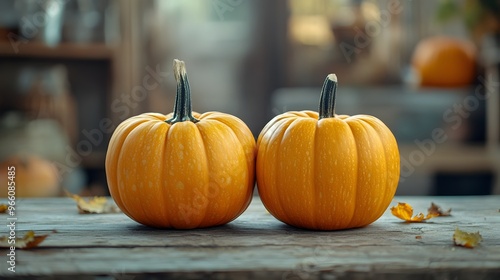 Two Autumn Pumpkins on Rustic Wooden Table in Halloween and Thanksgiving Scene