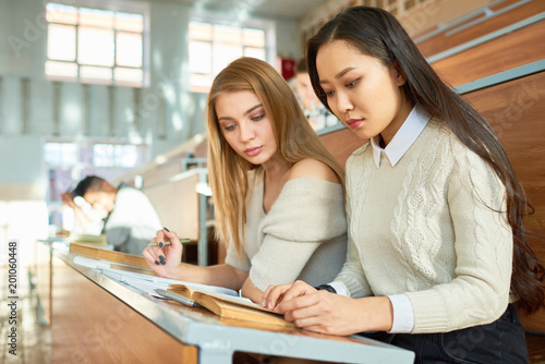 Two beautiful girls studying notes sitting at desk in lecture hall of modern college, copy space