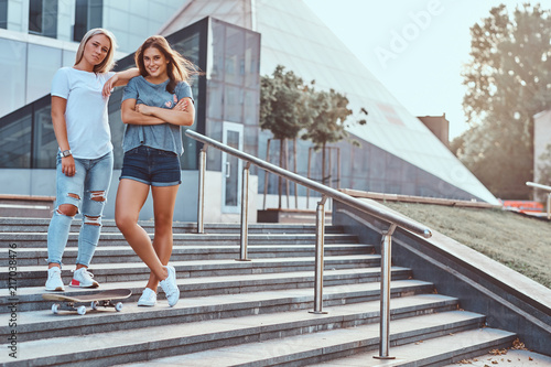 2, friends, metropolis, t-shirt, jean, caucasian, sunny, step, fashion, lifestyle, background, girl, summer, young, beautiful, street, sport, skateboard, skater, skate, relax, activity, city, cool, blond, female, holiday, hipster, sexy, spring, board, vacation, stylish, skyscraper, portrait, city landscape, youth, energy, recreation, style, weekend, travel, people, extreme, copy space