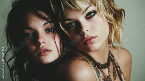 two beautiful young women with long dark and blonde hair in a studio setting featuring soft lighting and intriguing expressions.
