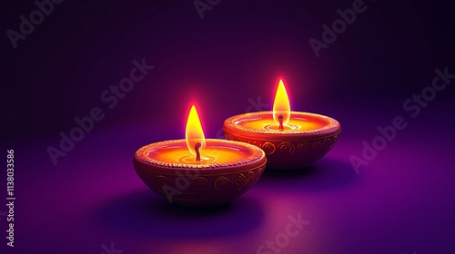 Two beautifully crafted clay lamps with flickering flames, casting a warm glow against a deep purple background.