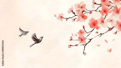 bird, bird, flying, flight, cherry, blossom, bloom, flower, flower, tree branch, branch, tree, pink, red, peach, watercolor, painting, art, asian, japanese, chinese, spring, nature, delicate, gentle, pastel, soft, serene, calm, peaceful, minimalist, elegant, beauty, freedom, sky, background, image, illustration, design, graphic, artwork