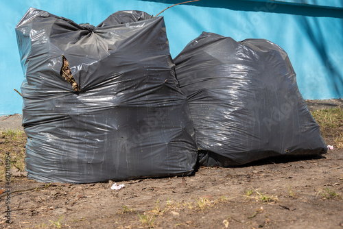 Two black plastic bags filled with garbage on the background of the blue wall of the house, street cleaning.