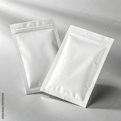 Two blank white foil pouches on a gray surface packaging