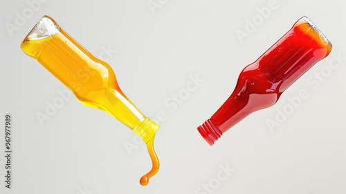 Two bottles of ketchup and one bottle of liquid condiment on a surface