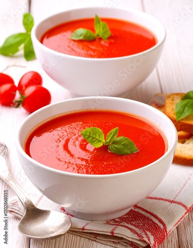 soup, tomatoes, red, bowl, white, basil, bread, garnish, healthy, food, kitchen, rustic, delicious, hot, summer, smooth, creamy, italian, comfort, lunch, dinner