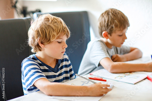 Two boys doing homework together. Brothers, siblings and twins learning at home. Elementary school students, children writing.