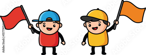 boy, boy, children, children, children, children, youth, friends, friends, team, teamwork, flag, flag, red, orange, cap, hat, happy, cheerful, smile, smiling, gesture, signal, wave, waving, playful, fun, cute, cartoon, character, person, people, standing, isolated, white background, vector, illustration, casual attire, outfit, communication, sport, game, activity, competition, event, outdoors, energy, joy, enthusiasm