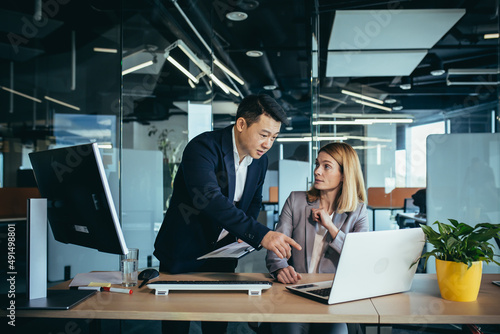 two business people consulting on a project looking at computer monitor screen sitting in the office. Asian male employee Coworker explains colleagues ideas and strategies accountant, financial report