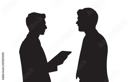 silhouette, business, man, discussion, meeting, conversation, communication, collaboration, agreements, teamwork, colleague, professional, tablet, technology, device, digital, presentation, briefing, information, black, white, contrast, minimalist, vector, graphic, illustration, design, isolated, modern, leadership, partnership, woman, people, couple, love, boy, person, fashion, children, family, silhouette, shadow, body, shopping, dancing