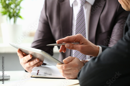 Two businessman are looking and studying statistics on tablet display closeup. Male hand opponent holds pen and points out problem collaboration business coach cooperation partnership palm concept