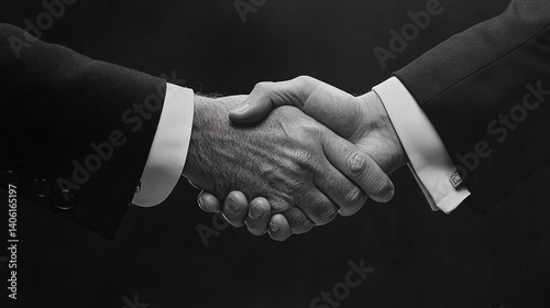 Two businessmen shaking hands, close-up on their hands in a professional setting