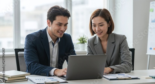 Two businesspeople, a man and a woman, smiling while working together on a laptop, reviewing data and charts on a desk in a modern office; concept for business collaboration, teamwork, and partnership