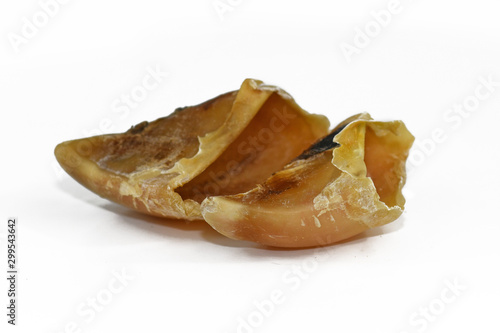 Two calf hoofes, healthy natural chewing treats for dog teeth hygiene, on white background