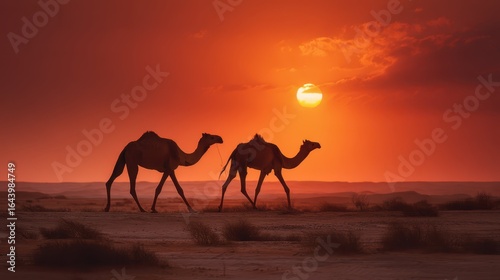 Two Camels Walking in the Desert at Sunset with Orange Sky