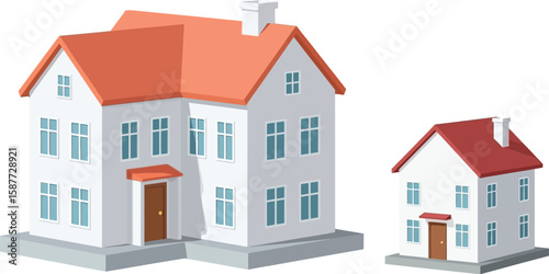 Two cartoon houses with red roofs and white walls isolated on a white background