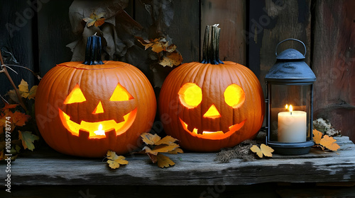Two Carved Pumpkins Glow on Wooden Porch for Halloween with Lantern