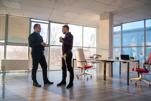 Two Caucasian men talking at work in the office.