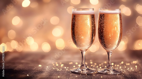 Two Champagne Flutes Sparkle on a Wooden Table against a Festive Bokeh Background, Celebrating Beautifully.
